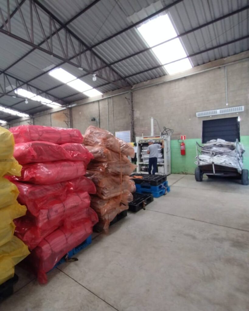 Nessa etapa, quanto aos bags e uniformes, são desvirados e a utilização de exautores permitea retira das partículas solidas,dando início ao processo de triagem sendo separados e preparados para lavagem.